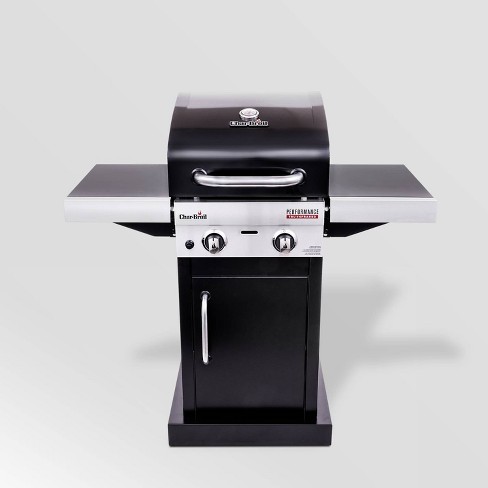 The char broil commercial series 2 burner gas grill features a sleek stainless steel design that looks great on a patio or in the backyard.